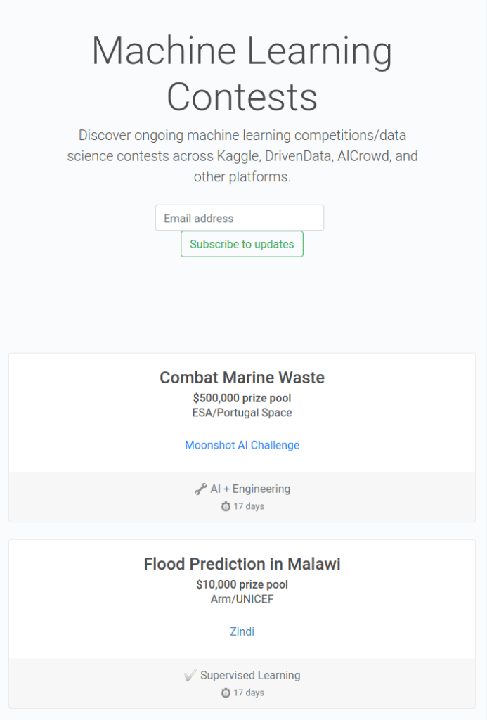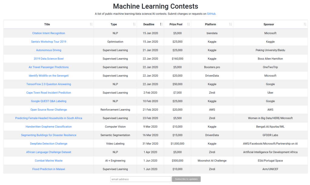 A few months ago I was looking for a directory of ongoing machine learning competitions (like the kind you get on Kaggle), but I couldn’t find one.